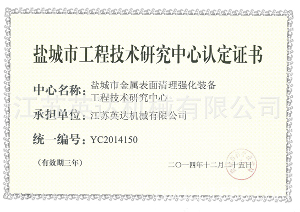 公司率先通過(guò)ISO9001:2008質(zhì)量管理體系認(rèn)證、ISO14001:2004環(huán)境管理體系認(rèn)證。擁有一支專業(yè)的技術(shù)團(tuán)隊(duì),先后取得了網(wǎng)帶通過(guò)式拋丸機(jī)、新型機(jī)械回收噴砂房、輥道通過(guò)式重鋼拋丸機(jī)等三十項(xiàng)產(chǎn)品專利。(注:各項(xiàng)產(chǎn)品專利及所有證書詳見企業(yè)官網(wǎng):http://www.ydzj.net/或阿里誠(chéng)信檔案)